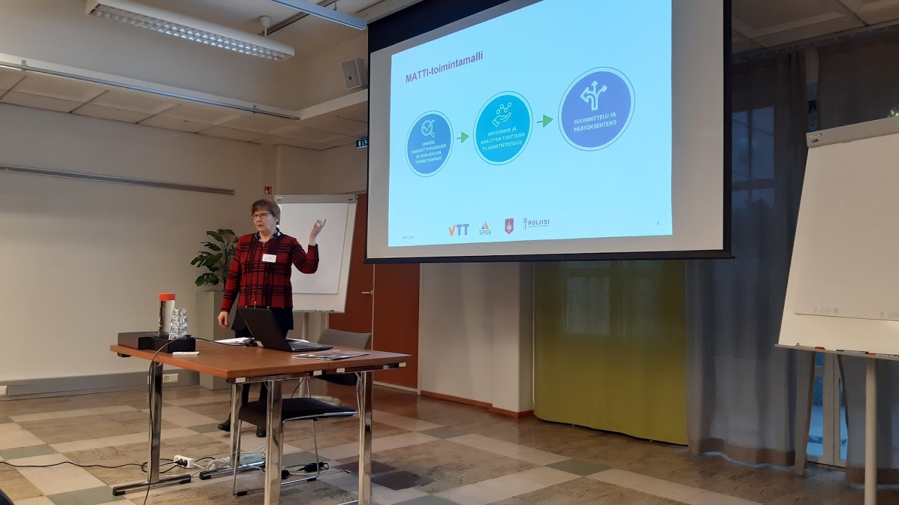 Erikoistutkija Riitta Molarius VTT:ltä esittelee tutkimusta Valtakunnallisessa turvallisuusseminaarissa Hämeenlinnassa.